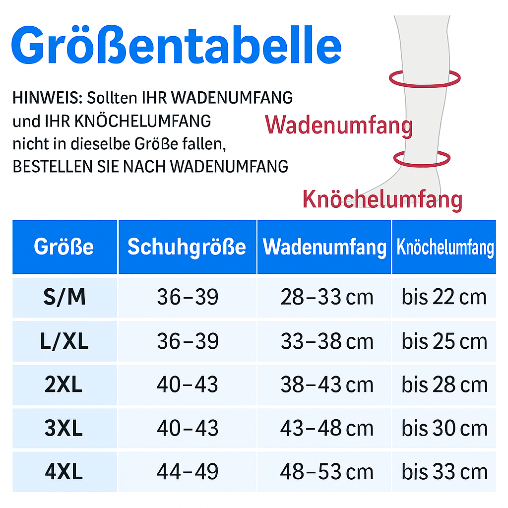 Nutze unsere Grössentabelle auf der Produktseite – im Zweifelsfall an deinem Wadenumfang orientieren.